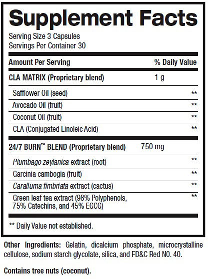 BPI's proprietary CLA matrix (a complex ingredient that combines sunflower, avocado, and coconut oils with conjugated linoleic acid (CLA))BURN Blend Formulated with a complex of ingredients including Garcinia Cambogia, green tea extract, and cactus extract.