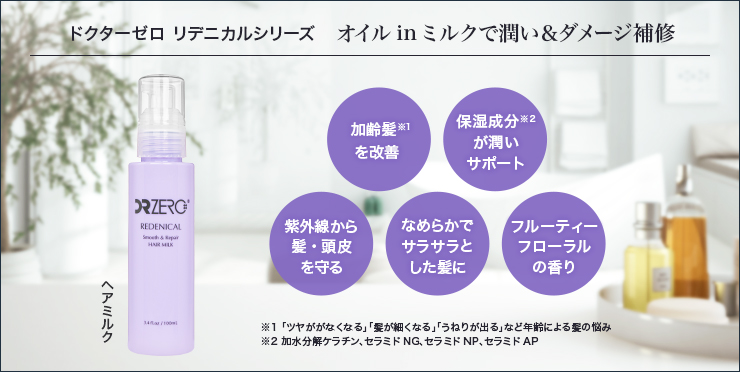 (Dr. Zero) Redenical Smooth & Repair Hair MilkHair treatment that addresses the concerns of aging hairis.shea butterorMoisturizing ingredients,Hair repair ingredientsIt is formulated withDryorundulation,spreadApproach to such problems.For moisturized, lustrous hair all the way to the endsleads to.