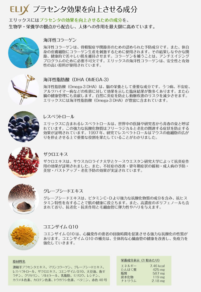 Concentrated sheep placenta extract, marine collagen, grape seed extract, resveratrol, pomegranate extract, coenzyme Q10, soybean oil, fish gelatin, glycerin, sorbitol, milk fat, beeswax, lecithin, caramel color, carotene color, chili pepper color, betanin, red No. 40