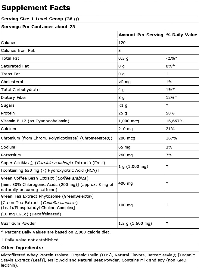 Formulated with whey protein isolate, Super Citrimax, green coffee bean extract, and green tea extract to help manage weight and appetite.