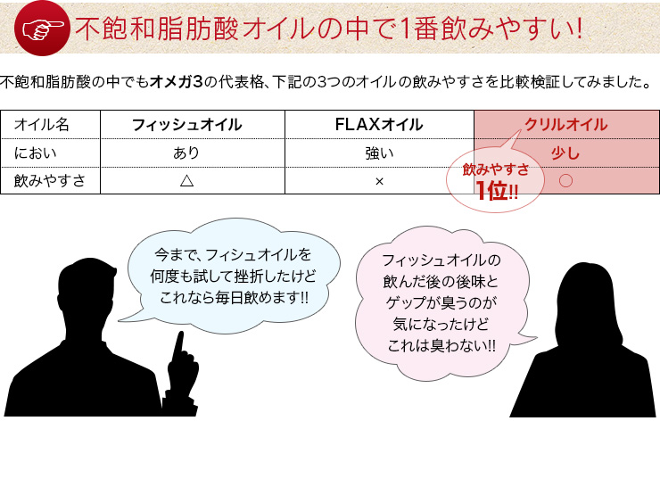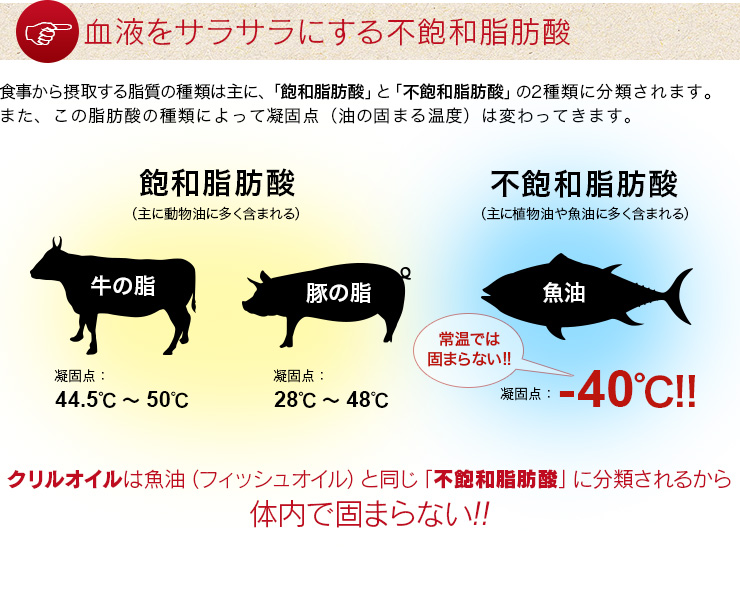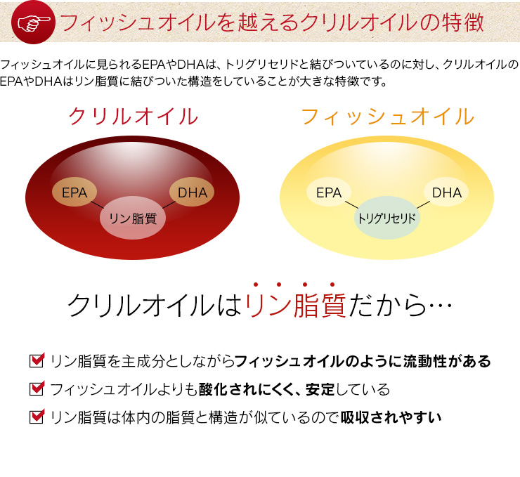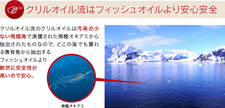 General Higher absorption than fish oilThe reason for this is that the DHA and EPA contained in krill oil are bound to lecithin (phospholipids), and this structure allows DHA and EPA to be efficiently absorbed by the human body. This oil is extracted from krill that live in the Antarctic, and due to the harsh environment of the extreme cold,Less polluted and cleaner oil than other oceansis.