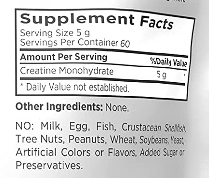 Micronized Creatine MonohydrateFlavorless 100% PureIt contains no fillers or additives and is also free from milk, eggs, fish, shellfish, tree nuts, peanuts, wheat, soybeans, yeast, artificial colors, artificial flavors, sugar and preservatives.
