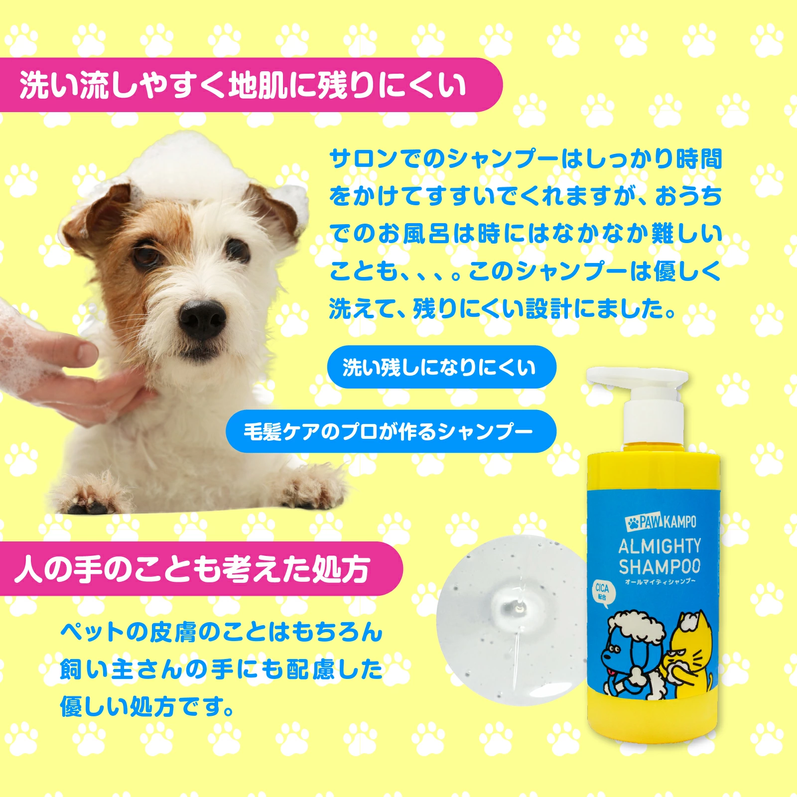 プロであるトリマーとは違い、おうちでの飼い主さんによるシャンプーでは十分な洗い流しができずに、成分が皮膚に残ってかゆみや皮膚炎になることがあります。Paw Kampoのオールマイティシャンプーは、ペットの皮膚にもヒトの手にも優しい成分を使っているだけでなく、すすいだ際に洗い残しが出にくいよう設計。皮膚トラブルの原因からペットを守ります。
