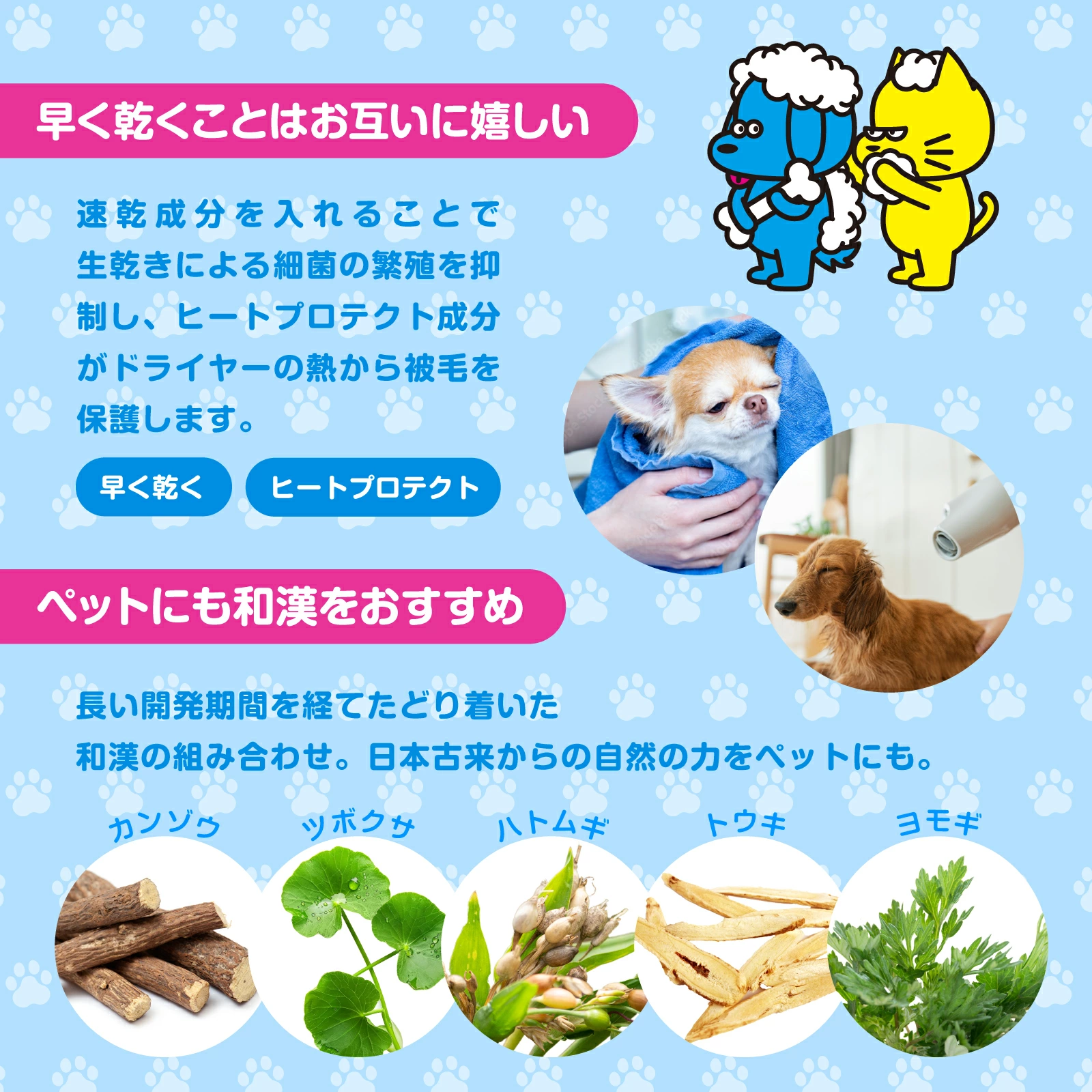 ヒートプロテクト成分配合で、ドライヤーの際の熱ダメージからペットの被毛と皮膚を守ります。