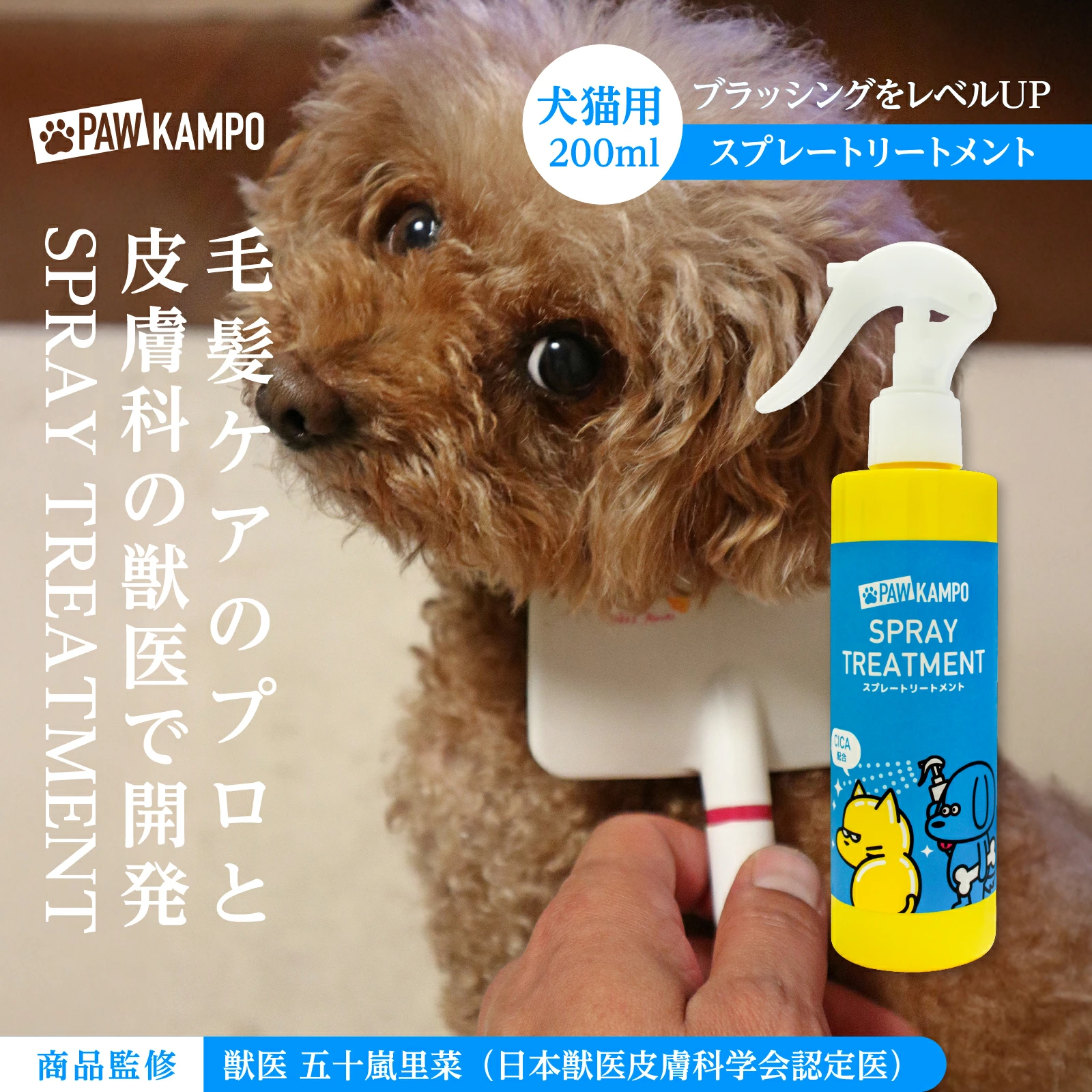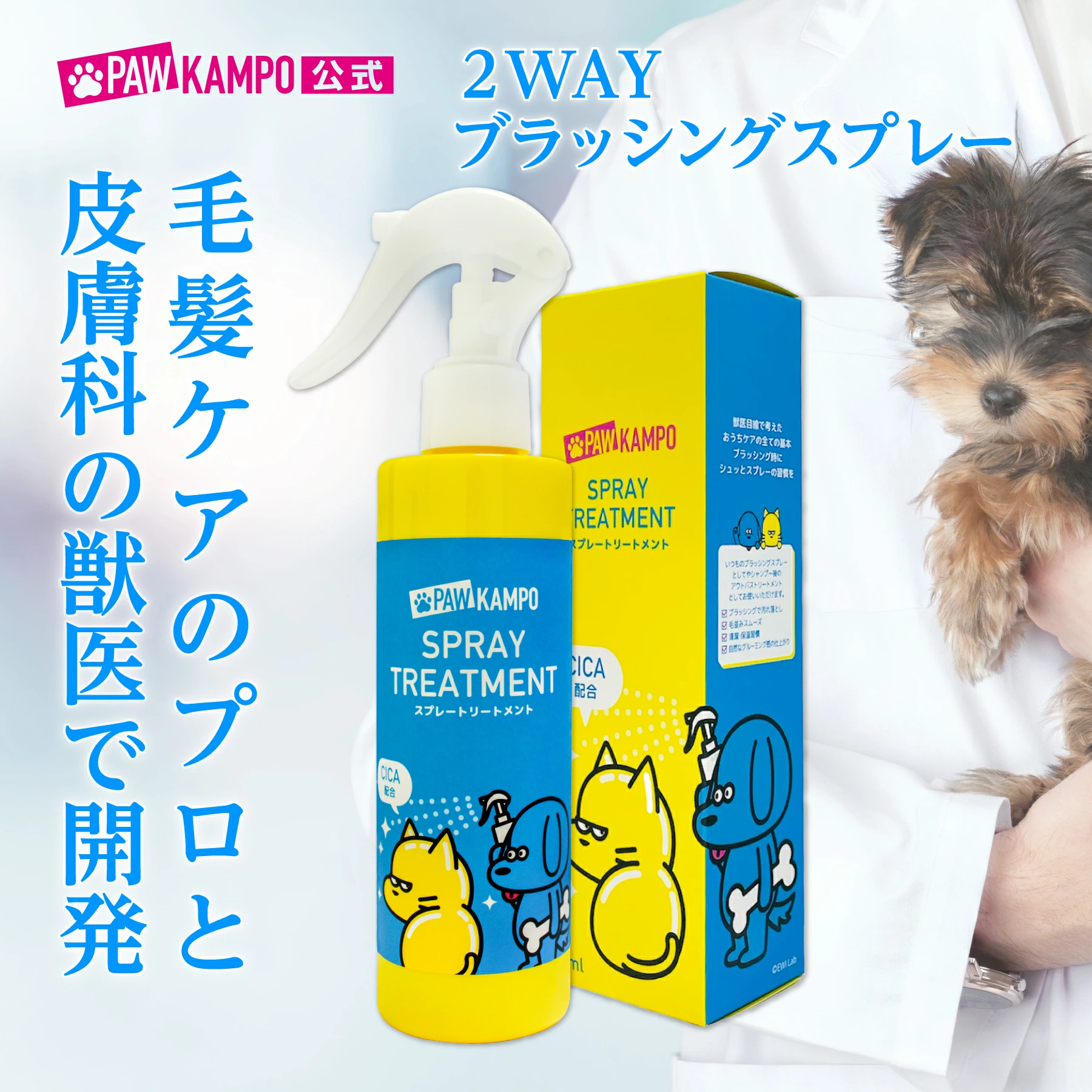 獣医師の目線で開発された、犬猫の被毛ケア用トリートメントスプレーです。毎日のブラッシングのプラスαとして、また、シャンプー後のアウトバストリートメントとしても使えます。