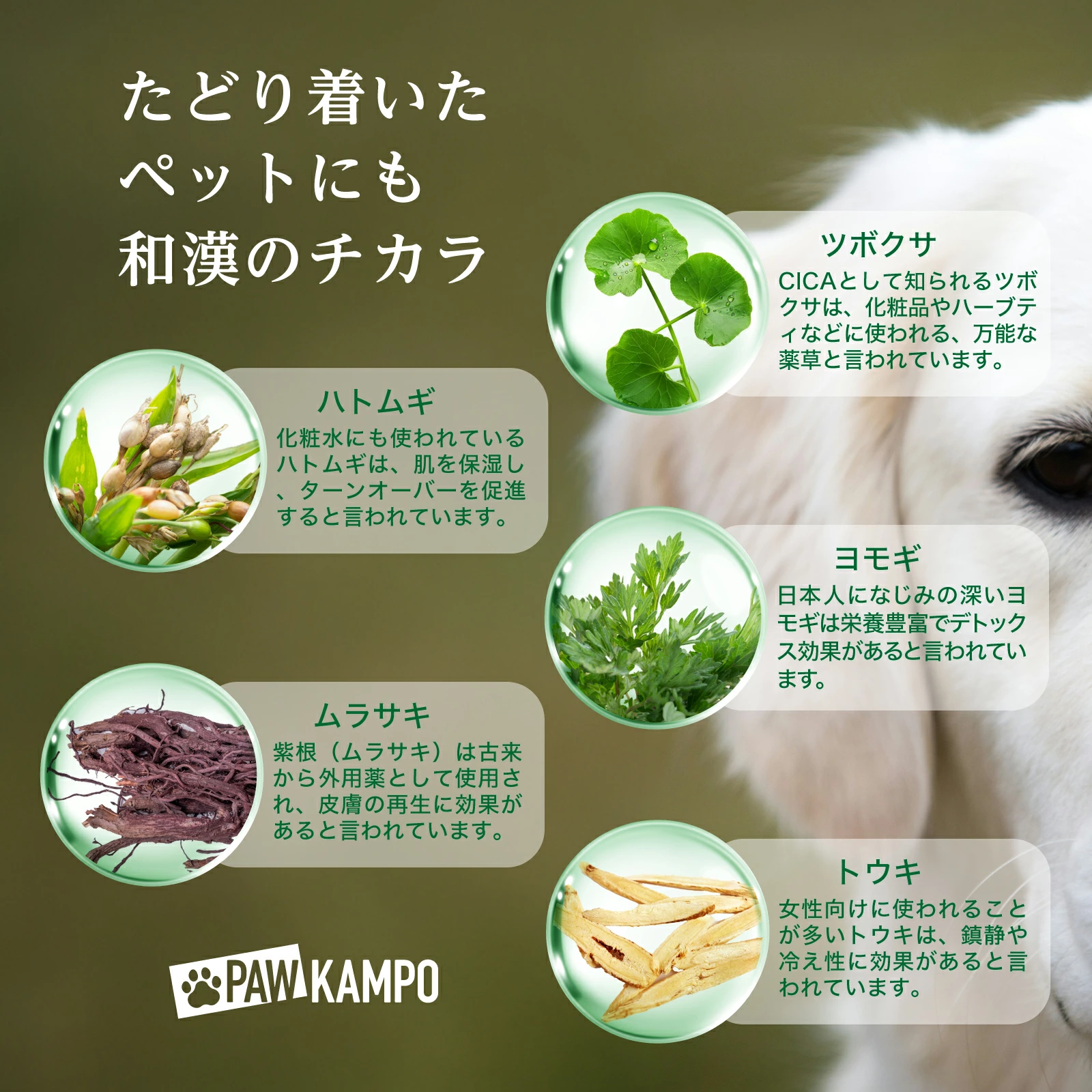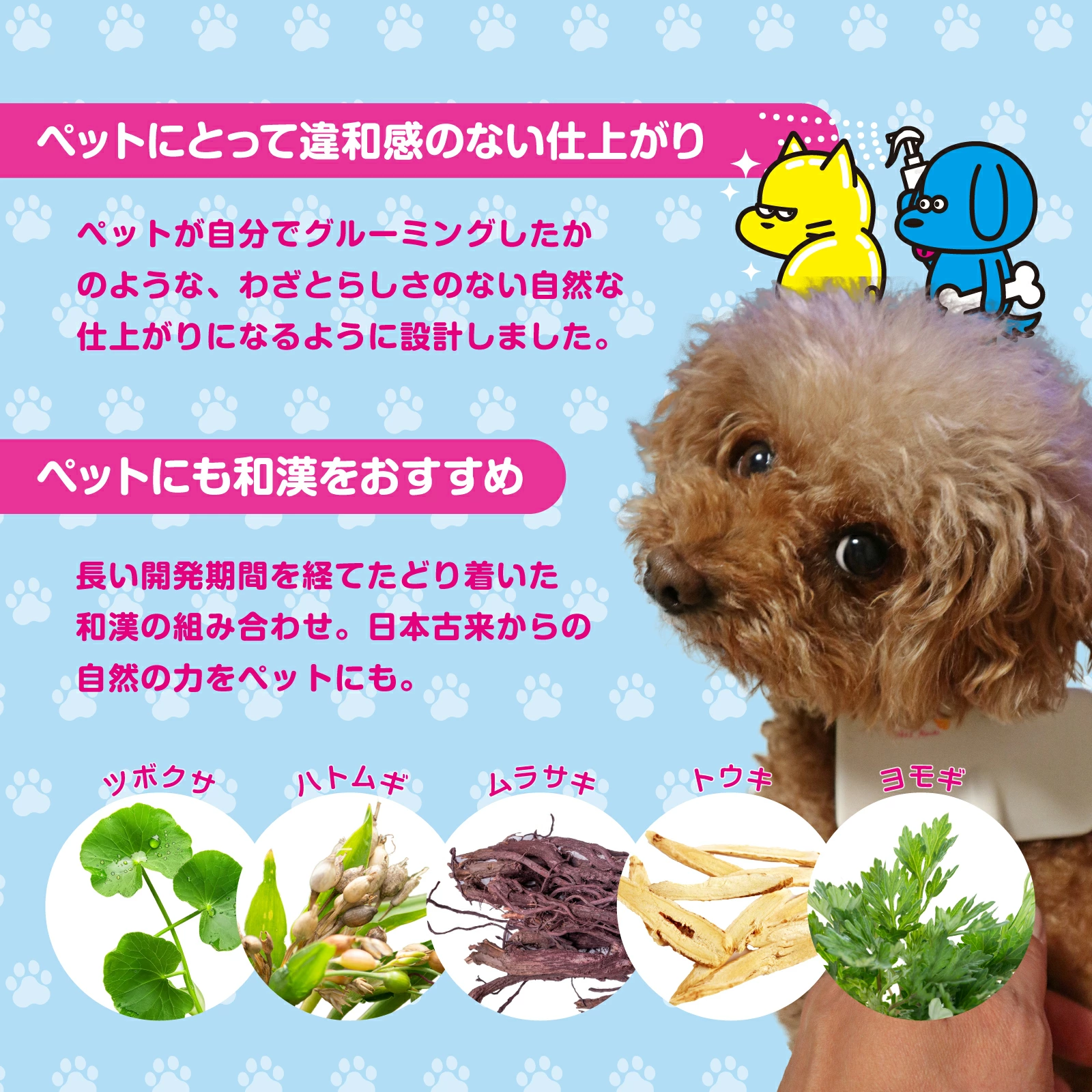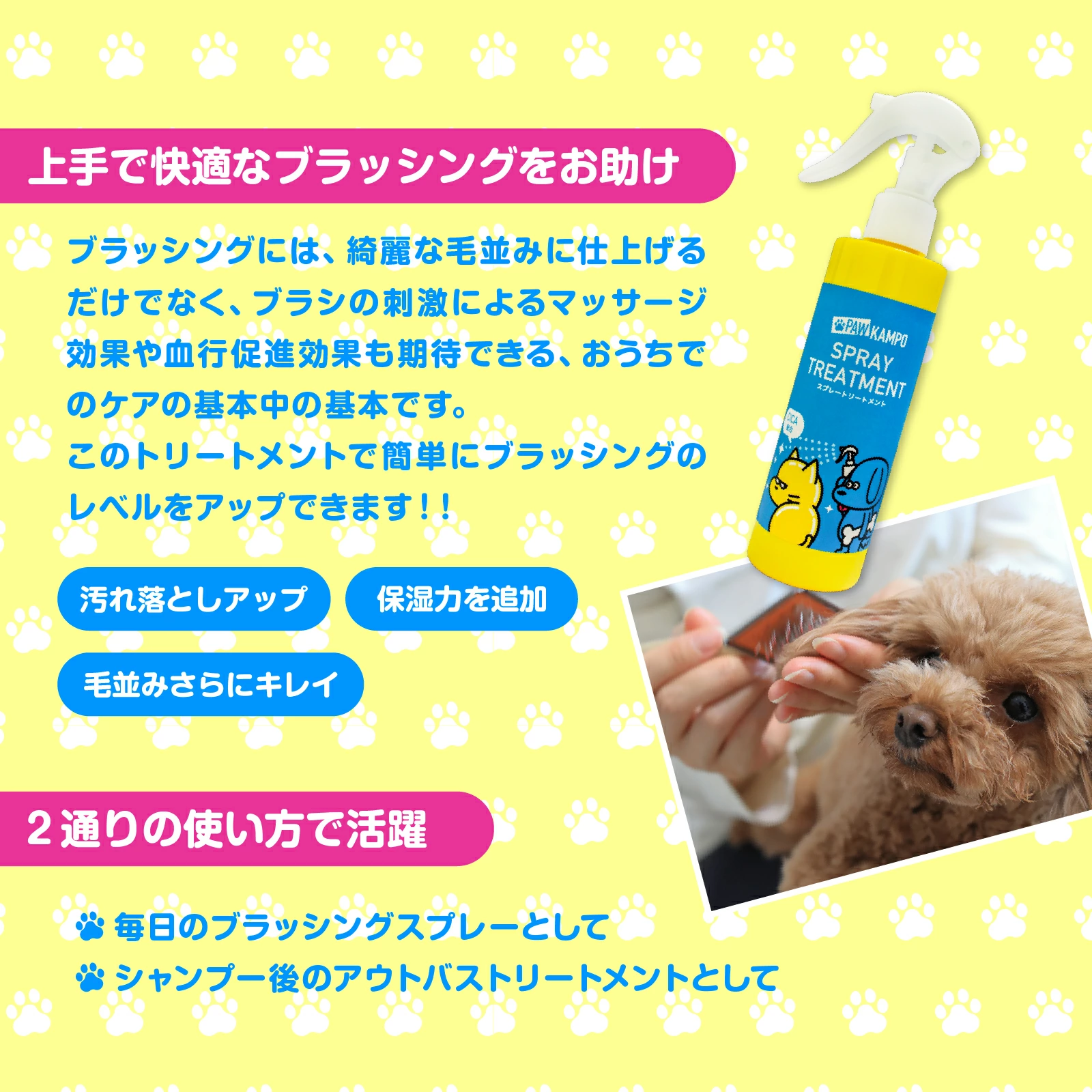 PAW KAMPOのスプレートリートメントには、CICA(ツボクサ)、ハトムギ、ヨモギ、ムラサキ、トウキの5つの和漢ハーブを配合。汚れを落とすと同時に潤いを与えて、ツヤツヤ&スムースな美しい毛並みに整えます。