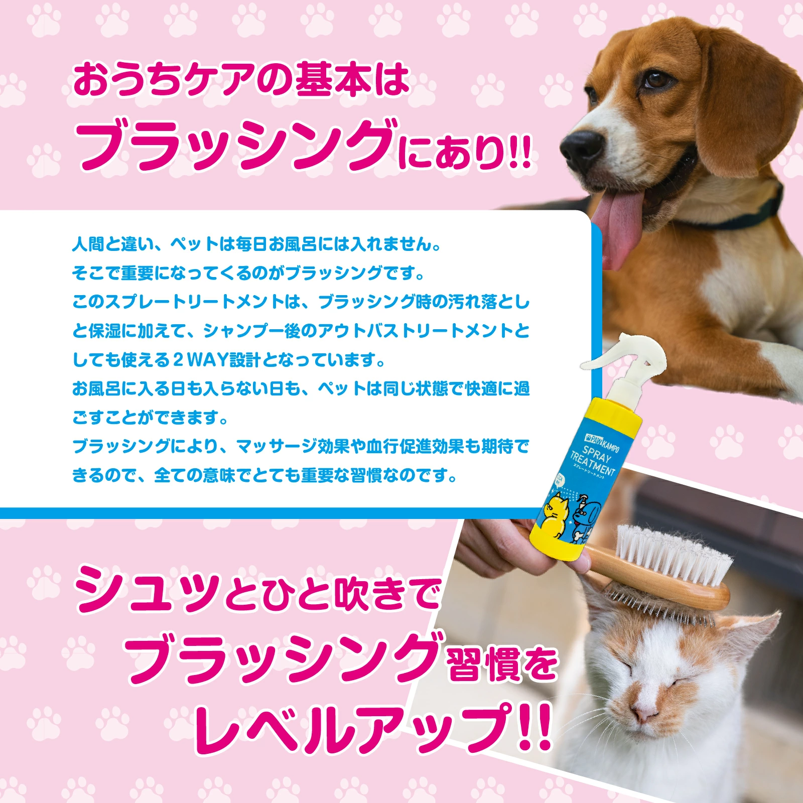 そこで考えたのが、ブラッシングケア。スプレートリートメントには、CICA(ツボクサ)、ハトムギ、ヨモギ、ムラサキ、トウキの5種の和漢ハーブを配合しており。汚れを落とすと同時に潤いを与えます。ブラッシングと並行してマッサージもでき、皮膚への刺激で血流が促進。清潔になるだけでなく、艶々なめらかな毛並みに仕上がります。